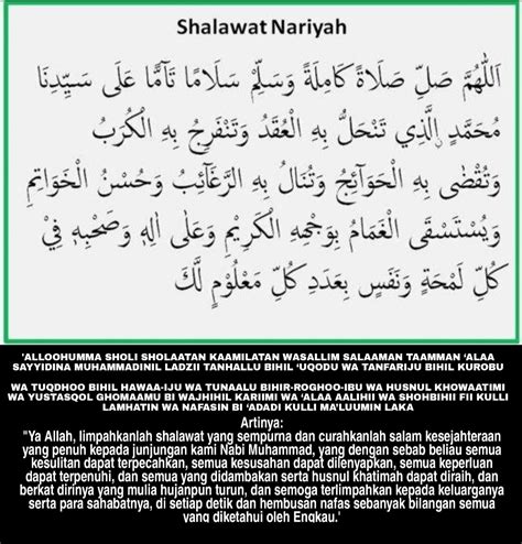 Sholawat Nariyah Dan Artinya : Allahumma Sholli Sholatan Kamilatan Salawat Nariyah Arab Latin : Penjelasan lengkap sholawat nariyah dan artinya.. Sholawat nariyah memiliki banyak keutamaan dan sholawat nariyah merdu di dengar apalagi videoku ini sholawat nariyah lirik jadi mudah di ikuti oleh semua kal. Bersholawat merupakan kegiatan amalan yang sangat disenangi oleh allah swt. Selamat datang kembali di website doaseharihari. Tentu ini adalah bentuk ikhtiar umat muslim bertahan selama pandemi. Juga akan dihindarkan dari seluruh cobaan (bala').